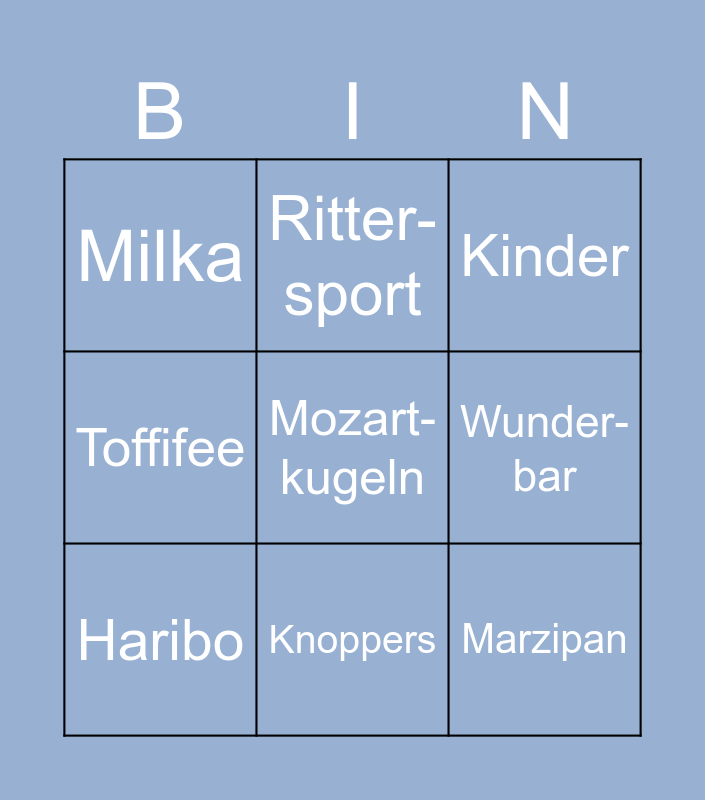 This bingo card has 9 words: Haribo, Kinder, Ritter- sport, Toffifee, Milka, Wunder- bar, Mozart- kugeln, Marzipan and Knoppers.