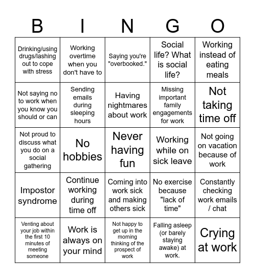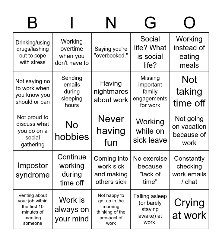This bingo card has 25 words: Continue working during time off, Not happy to get up in the morning thinking of the prospect of work, Having nightmares about work, Venting about your job within the first 10 minutes of meeting someone, Working instead of eating meals, Drinking/using drugs/lashing out to cope with stress, Not saying no to work when you know you should or can, Working overtime when you don't have to, Working while on sick leave, Coming into work sick and making others sick, Missing important family engagements for work, Not proud to discuss what you do on a social gathering, No exercise because "lack of time", Constantly checking work emails / chat, Sending emails during sleeping hours, Crying at work, Not going on vacation because of work, Saying you're "overbooked.", Not taking time off, No hobbies, Never having fun, Work is always on your mind, Impostor syndrome, Social life? What is social life? and Falling asleep (or barely staying awake) at work..