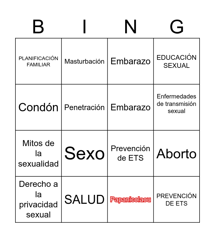 ⚠ This card has duplicate items: Embarazo (2), Papanicolaou (2), Condón (2), Aborto (2), SIDA (2), Sexo (2)