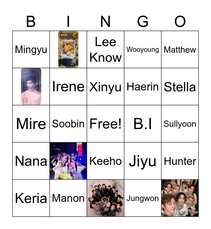 This bingo card has 10 images, a free space and 40 words: Irene, Wooyoung, Hunter, Jiyu, Mark, Rei, Xinyu, B.I, Hikaru, Matthew, Soobin, Jungwon, Mingyu, Haerin, Jennie, Somi, Stella, Swan, Lee Know, Keeho, Eric Nam, BM, Ruka, Yonghee, Manon, Leehan, Rowoon, Yeji, Sejeong, Sullyoon, Anton, Giuk, Ezreal, Faker, Keria, Mire, BoA, Belle, Nana and Nayeon.