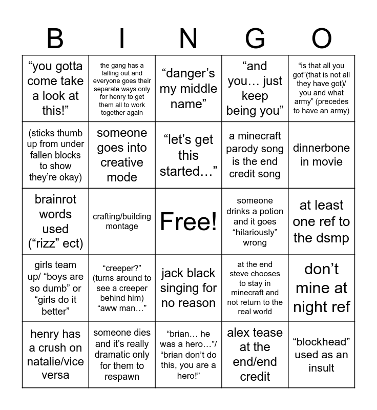 This bingo card has a free space and 24 words: “creeper?” (turns around to see a creeper behind him) “aww man…”, someone dies and it’s really dramatic only for them to respawn, “let’s get this started…”, henry has a crush on natalie/vice versa, “is that all you got”(that is not all they have got)/ you and what army” (precedes to have an army), “you gotta come take a look at this!”, (sticks thumb up from under fallen blocks to show they’re okay), the gang has a falling out and everyone goes their separate ways only for henry to get them all to work together again, someone drinks a potion and it goes “hilariously” wrong, jack black singing for no reason, a minecraft parody song is the end credit song, brainrot words used (“rizz” ect), at the end steve chooses to stay in minecraft and not return to the real world, don’t mine at night ref, someone goes into creative mode, alex tease at the end/end credit, at least one ref to the dsmp, “danger’s my middle name”, dinnerbone in movie, crafting/building montage, “blockhead” used as an insult, girls team up/ “boys are so dumb” or “girls do it better”, “and you… just keep being you” and “brian… he was a hero…”/ “brian don’t do this, you are a hero!”.