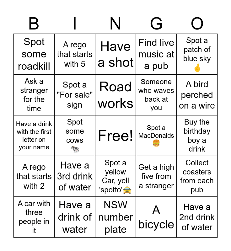 This bingo card has a free space and 26 words: Spot a yellow Car, yell 'spotto'🚖, A bicycle, Road works, Have a drink of water, Spot a patch of blue sky 🤞, Spot some roadkill, Ask a stranger for the time, A rego that starts with 5, Buy the birthday boy a drink, Get a high five from a stranger, Someone who waves back at you, Have a drink with the first letter on your name, Collect coasters from each pub, A car with three people in it, Spot some cows 🐄, A bus stop, Find live music at a pub, A rego that starts with 2, Have a shot, Have a 2nd drink of water, A bird perched on a wire, NSW number plate, Spot a MacDonalds 🍔, Have a 3rd drink of water, Spot a "For sale" sign and Toyota Hiace, just like Logans.