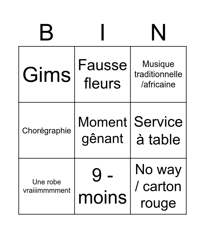 This bingo card has a free space and 8 words: Service à table, Musique traditionnelle /africaine, Fausse fleurs, Une robe vraiiimmmment, Gims, No way / carton rouge, Chorégraphie and 9 - moins.