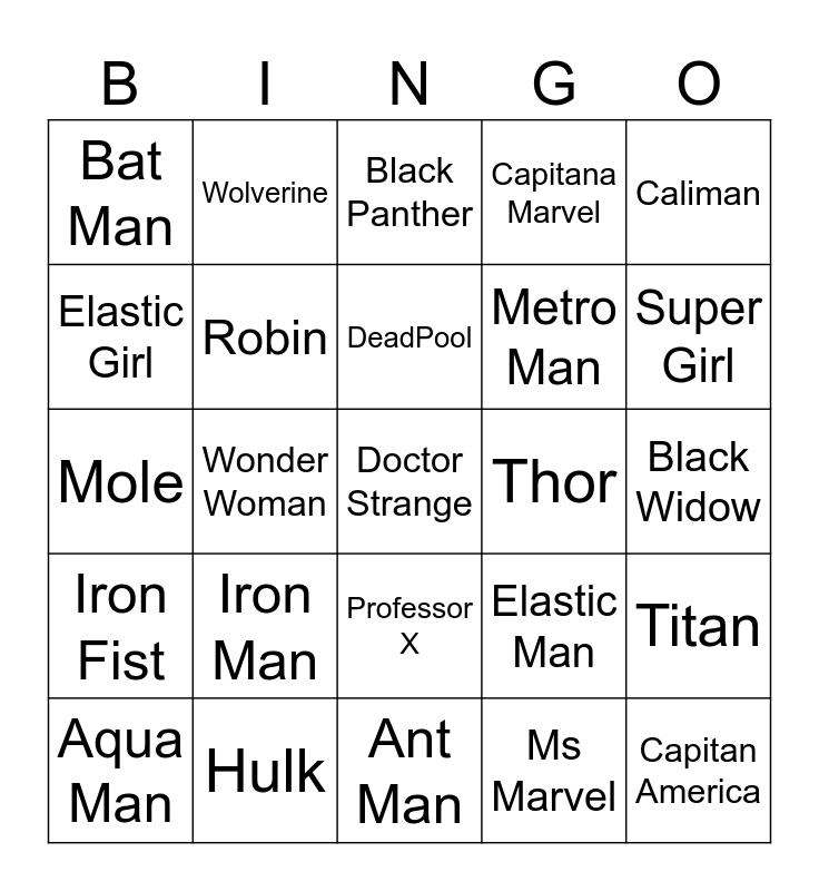 This bingo card has a free space and 29 words: Aqua Man, Flash, Wonder Woman, Spider Man, Bat Man, Black Panther, Robin, Iron Man, Thor, Hulk, Black Widow, Capitan America, Ant Man, Ms Marvel, Super Girl, Falcon, Professor X, Iron Fist, Caliman, Mole, Elastic Man, Mujer Invisible, Metro Man, Elastic Girl, Capitana Marvel, Wolverine, Titan, DeadPool and Ghost Spider.