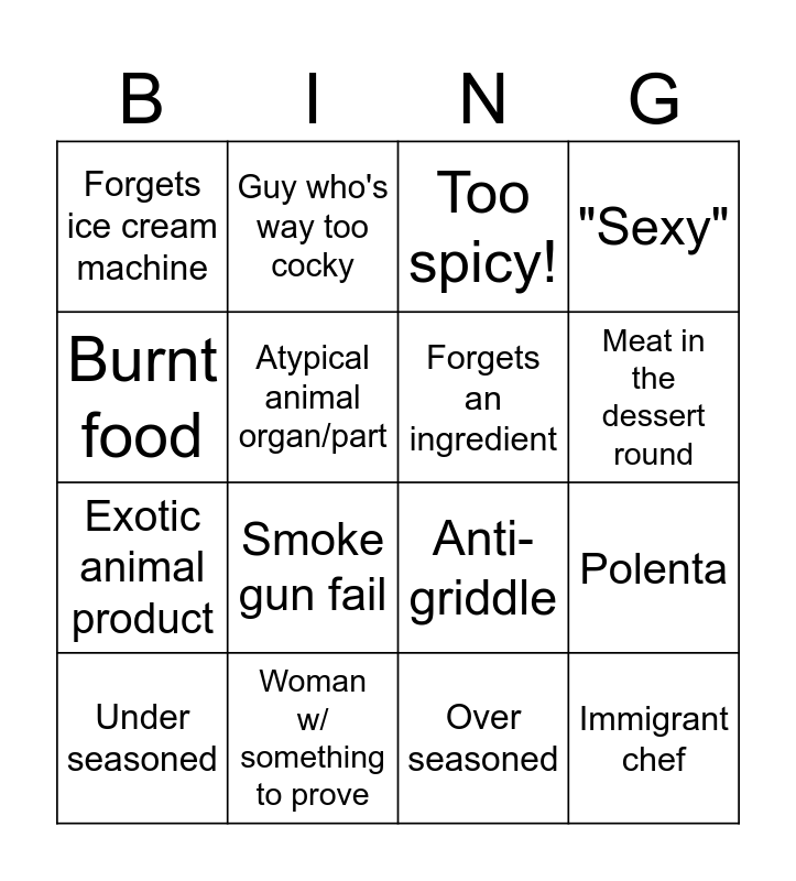 This bingo card has 30 words: Pana cotta, Puff pastry, Polenta, Cuts themselves, Forgets ice cream machine, Too spicy!, Forgets an ingredient, "I'm a Dad" guy, Woman w/ something to prove, Fresh ingredient guy, Over seasoned, Under seasoned, Geoffrey uses chopsticks, Amanda's ugly necklace, Smoke gun fail, Drops food on ground, Private chef, Immigrant chef, FIRE!!, Burnt food, Anti-griddle, Guest judge, Guy who's way too cocky, Exotic animal product, Atypical animal organ/part, "Sexy", Bad boy chef, Chef who disappointed their parents, Meat in the dessert round and Flambe tool used.