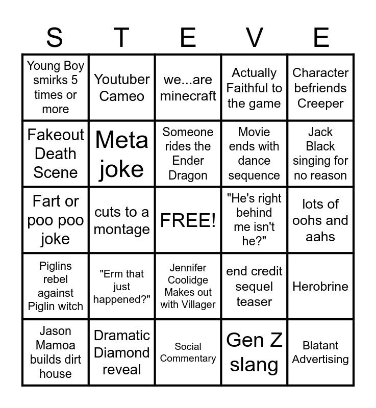 This bingo card has a free space and 24 words: "Erm that just happened?", Dramatic Diamond reveal, Someone rides the Ender Dragon, Jason Mamoa builds dirt house, Character befriends Creeper, Young Boy smirks 5 times or more, Fakeout Death Scene, Youtuber Cameo, "He's right behind me isn't he?", Jennifer Coolidge Makes out with Villager, Movie ends with dance sequence, Fart or poo poo joke, end credit sequel teaser, Herobrine, Meta joke, Gen Z slang, lots of oohs and aahs, we...are minecraft, Jack Black singing for no reason, cuts to a montage, Blatant Advertising, Piglins rebel against Piglin witch, Actually Faithful to the game and Social Commentary.