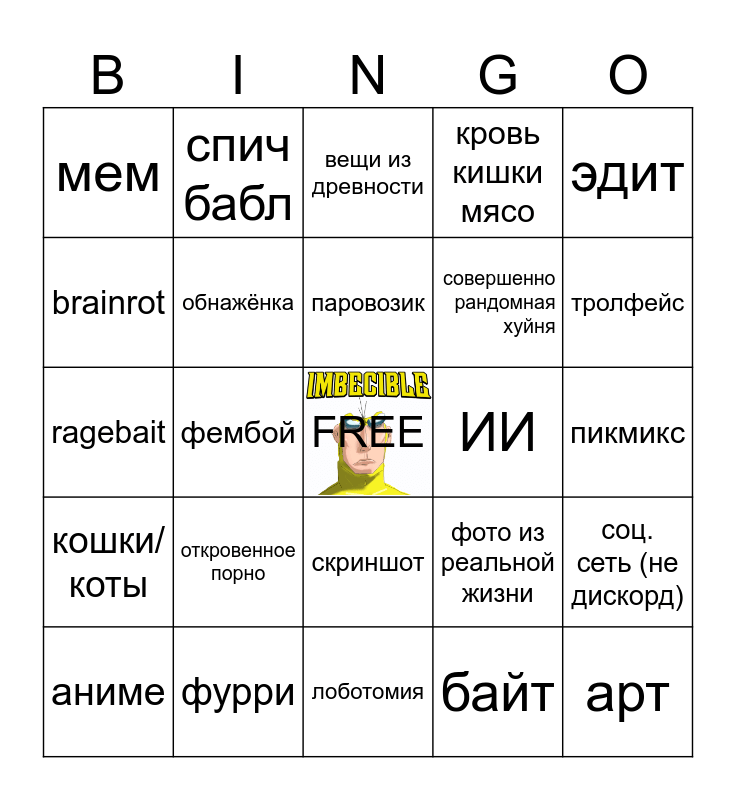 This bingo card has a free space and 24 words: откровенное порно, фурри, паровозик, аниме, эдит, мем, brainrot, спич бабл, ИИ, скриншот, совершенно рандомная хуйня, ragebait, фото из реальной жизни, соц. сеть (не дискорд), обнажёнка, байт, пикмикс, вещи из древности, тролфейс, фембой, арт, кошки/коты, кровь кишки мясо and лоботомия.