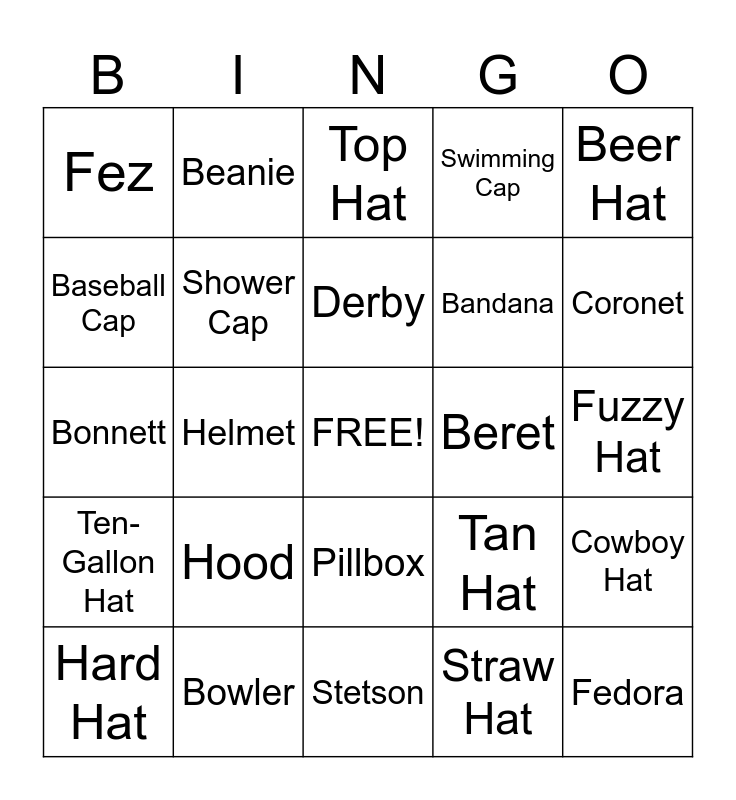 This bingo card has a free space and 28 words: Cowboy Hat, Visor, Bandana, Straw Hat, Baseball Cap, Top Hat, Beanie, Ten-Gallon Hat, Beret, Hard Hat, Bonnett, Swimming Cap, Bowler, Stetson, Coronet, Sombrero, Hood, Shower Cap, Derby, Pillbox, Fez, Panama, Fedora, Helmet, Fuzzy Hat, Tan Hat, Beer Hat and Sombrero.