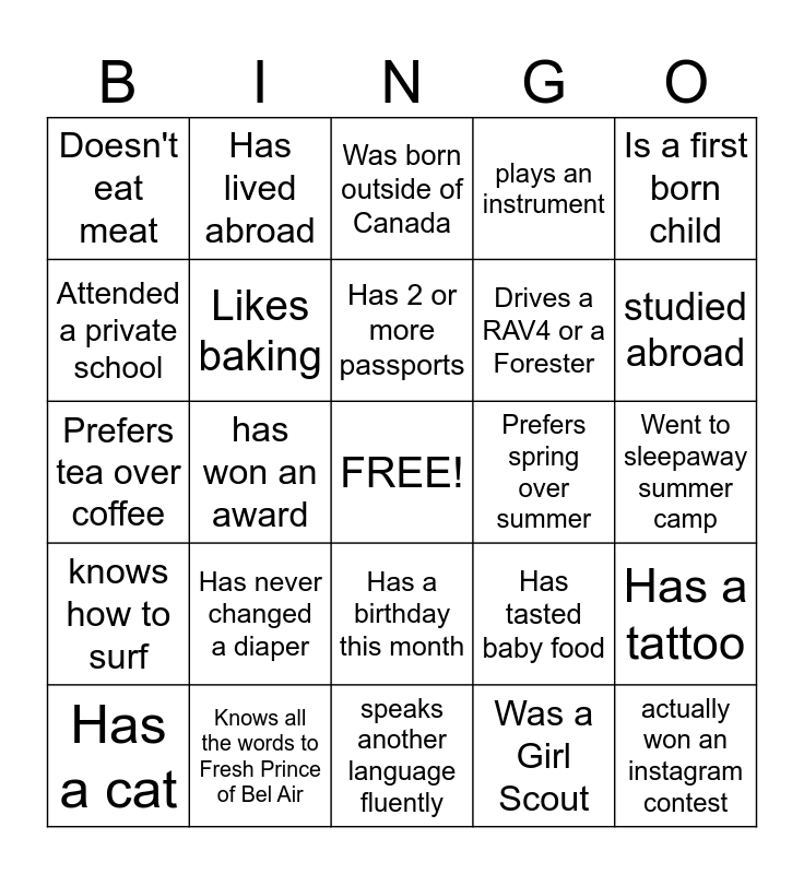 This bingo card has a free space and 24 words: Has never changed a diaper, Knows all the words to Fresh Prince of Bel Air, Has 2 or more passports, Has a cat, Is a first born child, Doesn't eat meat, Attended a private school, Has lived abroad, Prefers spring over summer, Has a birthday this month, Drives a RAV4 or a Forester, Prefers tea over coffee, Has tasted baby food, Has a tattoo, Likes baking, Was a Girl Scout, Went to sleepaway summer camp, Was born outside of Canada, studied abroad, has won an award, actually won an instagram contest, knows how to surf, plays an instrument and speaks another language fluently.