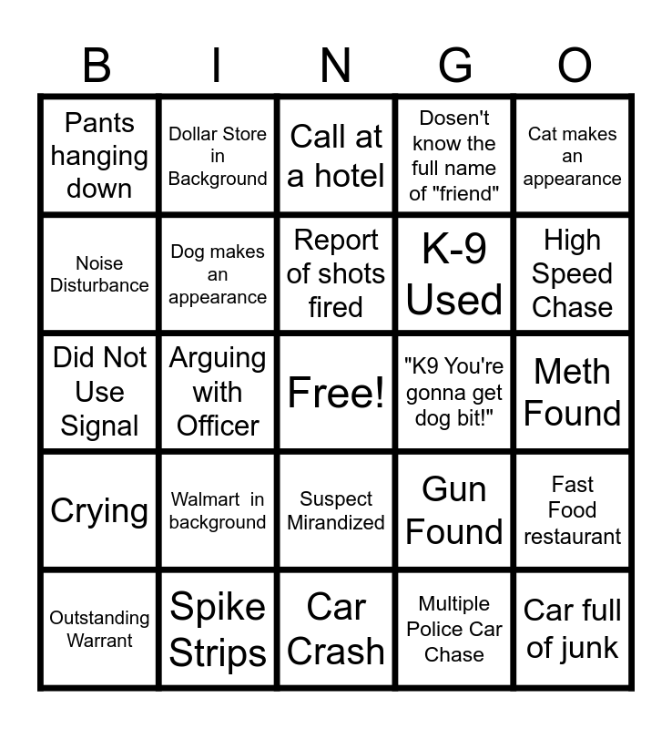 This bingo card has a free space and 76 words: No Insurance, Call about a fight at or outside a bar, Call at a hotel, Call at a convenience store (like 7-11), Host makes bad joke, Anything on fire (must see flames), Sassy black woman, Cop drives off-road / over curb or median, Touches rear of vehicle to leave prints, "Hands out of your pockets", Cop carrying rifle / shotgun, Trespassing, Report of shots fired, Noise Disturbance, Five Finger Discount, Arguing with Officer, Car Search, Car full of junk, Cash - Claims they just got paid, Cat makes an appearance, Children in Car, Did Not Use Signal, Dog makes an appearance, Dollar Store in Background, Dosen't know the full name of "friend", Drug Paraphernalia Found, Drugs / gun thrown out of car, Drunk, Failure to Comply, Field Sobriety Check, Foot Chase, Frequent Flyer / Repeat Offender, Gives False Name or Age, Gun Found, High Speed Chase, K-9 Used, License is Suspended, McDonald's in background, Meth Found, Multiple Police Car Chase, Needle Found, No I.D., Not My Car, Not My Drugs, Not My Pants, Open Container, Outstanding Warrant, Pants hanging down, Resisting Arrest, Shirtless Suspect, Suspect Handcuffed, Suspect Mirandized, Suspect Running from Car, Suspect Threatens Arresting Officers, Suspect complains that handcuffs are too tight / hurt, Suspect doesn't want to be on camera, Suspect wants to smoke, Tag Expired, Tail Light Out, Taser Deployed, Walmart in background, Weapons Drawn, Weed found, Welfare Check, Drug Test Kit Used, Shady Motel, "K9 You're gonna get dog bit!", PIT Maneuver, No shoes, No Shirt, Fast Food restaurant, Crying, Spike Strips, Noise complaint, Car Crash and Taser Deployed.