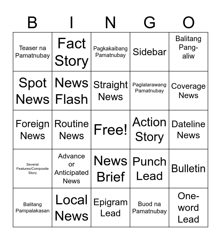 This bingo card has a free space and 24 words: Advance or Anticipated News, Local News, Straight News, Balitang Pampalakasan, Balitang Pang-aliw, Teaser na Pamatnubay, Spot News, Fact Story, Action Story, News Brief, Paglalarawang Pamatnubay, Foreign News, Punch Lead, Bulletin, News Flash, Buod na Pamatnubay, Dateline News, Pagkakaibang Pamatnubay, Coverage News, Routine News, One-word Lead, Several Features/Composite Story, Sidebar and Epigram Lead.