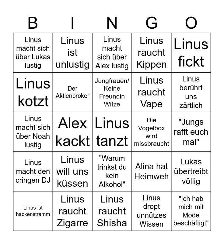 This bingo card has a free space and 24 words: Linus will uns küssen, Linus raucht Zigarre, Jungfrauen/ Keine Freundin Witze, Linus ist hackenstramm, Linus fickt, Linus macht sich über Lukas lustig, Linus kotzt, Linus ist unlustig, Die Vogelbox wird missbraucht, "Warum trinkst du kein Alkohol", Linus raucht Vape, Linus macht sich über Noah lustig, Alina hat Heimweh, Lukas übertreibt völlig, Der Aktienbroker, Linus dropt unnützes Wissen, "Jungs rafft euch mal", Linus macht sich über Alex lustig, Linus berührt uns zärtlich, Alex kackt, "Ich hab mich mit Mode beschäftigt", Linus macht den cringen DJ, Linus raucht Kippen and Linus raucht Shisha.