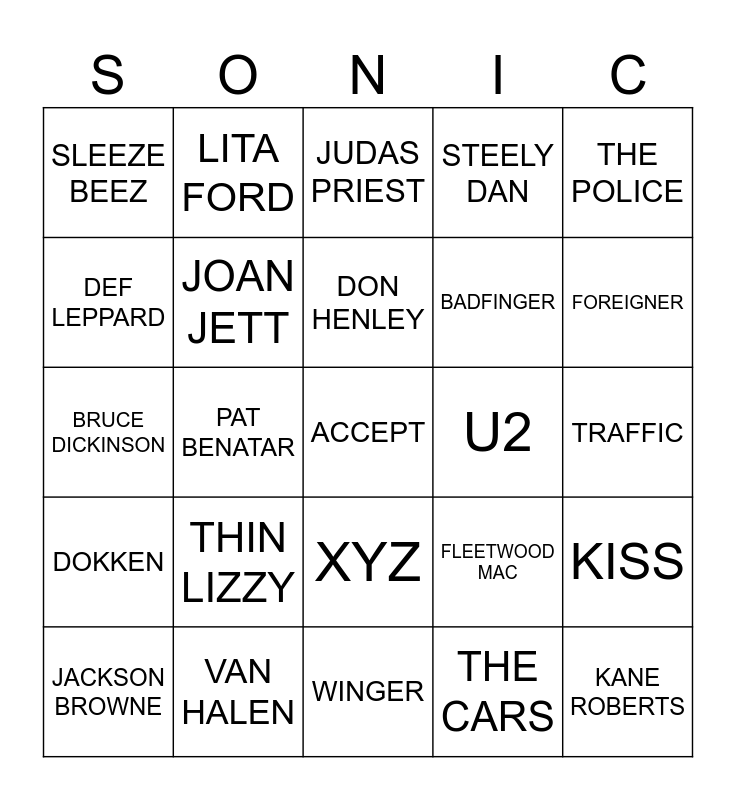 This bingo card has 33 words: KANE ROBERTS, CYNDI LAUPER, PAT BENATAR, CINDERELLA, DOKKEN, JOAN JETT, THE POLICE, JACKSON BROWNE, LITA FORD, LED ZEPPELIN, DON HENLEY, JUDAS PRIEST, THE BEATLES, AC/DC, U2, FOREIGNER, VAN HALEN, BRUCE DICKINSON, THIN LIZZY, FLEETWOOD MAC, XYZ, SAVATAGE, SLEEZE BEEZ, TRAFFIC, WINGER, ACCEPT, STEELY DAN, BADFINGER, DEF LEPPARD, KISS, EAGLES, THE CARS and JOURNEY.