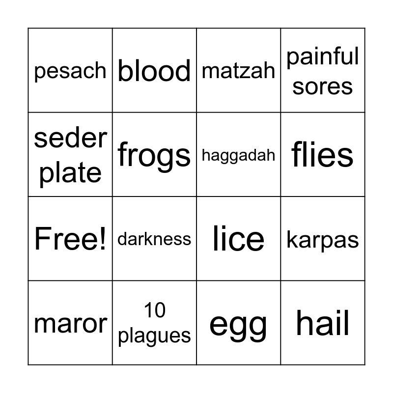 This bingo card has 20 words: karpas, salt water, matzah, charoset, maror, seder plate, 10 plagues, pesach, Free!, blood, darkness, lice, frogs, hail, haggadah, no bread, flies, painful sores, egg and shofar.