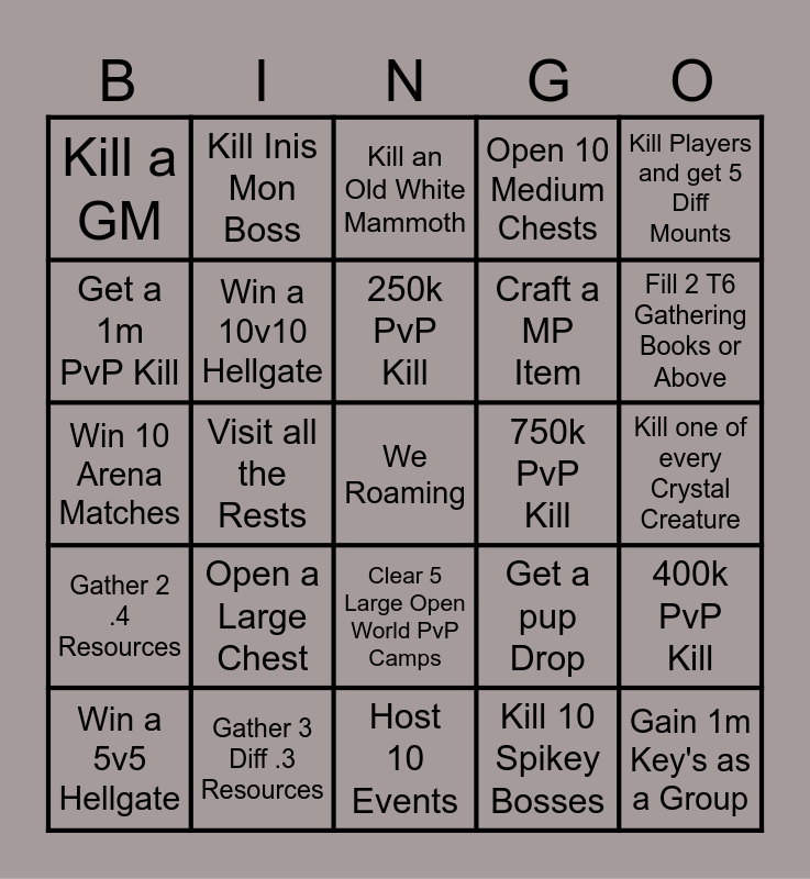 This bingo card has a free space and 24 words: Win a 5v5 Hellgate, Open a Large Chest, 250k PvP Kill, Kill 10 Spikey Bosses, Kill Players and get 5 Diff Mounts, Kill a GM, Kill Inis Mon Boss, Kill an Old White Mammoth, 750k PvP Kill, Kill one of every Crystal Creature, Win 10 Arena Matches, Win a 10v10 Hellgate, Get a pup Drop, 400k PvP Kill, Get a 1m PvP Kill, Gather 3 Diff .3 Resources, Host 10 Events, Open 10 Medium Chests, Fill 2 T6 Gathering Books or Above, Gather 2 .4 Resources, Visit all the Rests, Clear 5 Large Open World PvP Camps, Craft a MP Item and Gain 1m Key's as a Group.