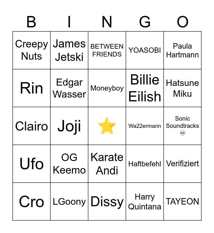 This bingo card has a free space and 24 words: OG Keemo, LGoony, Moneyboy, Cro, Paula Hartmann, Creepy Nuts, Rin, James Jetski, Wa22ermann, Karate Andi, Billie Eilish, Clairo, Haftbefehl, Verifiziert, Edgar Wasser, Harry Quintana, Sonic Soundtracks 💀, BETWEEN FRIENDS, Hatsune Miku, Joji, TAYEON, Ufo, YOASOBI and Dissy.