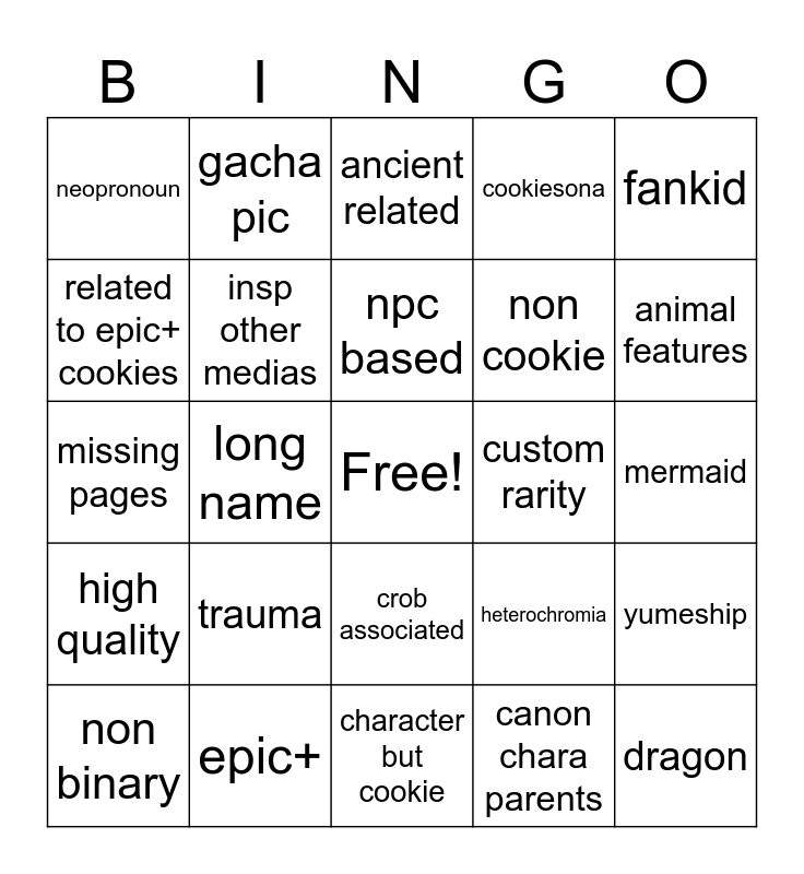 This bingo card has a free space and 24 words: trauma, epic+, npc based, non binary, fankid, neopronoun, related to epic+ cookies, gacha pic, custom rarity, crob associated, non cookie, missing pages, heterochromia, yumeship, insp other medias, canon chara parents, mermaid, ancient related, animal features, long name, dragon, high quality, cookiesona and character but cookie.