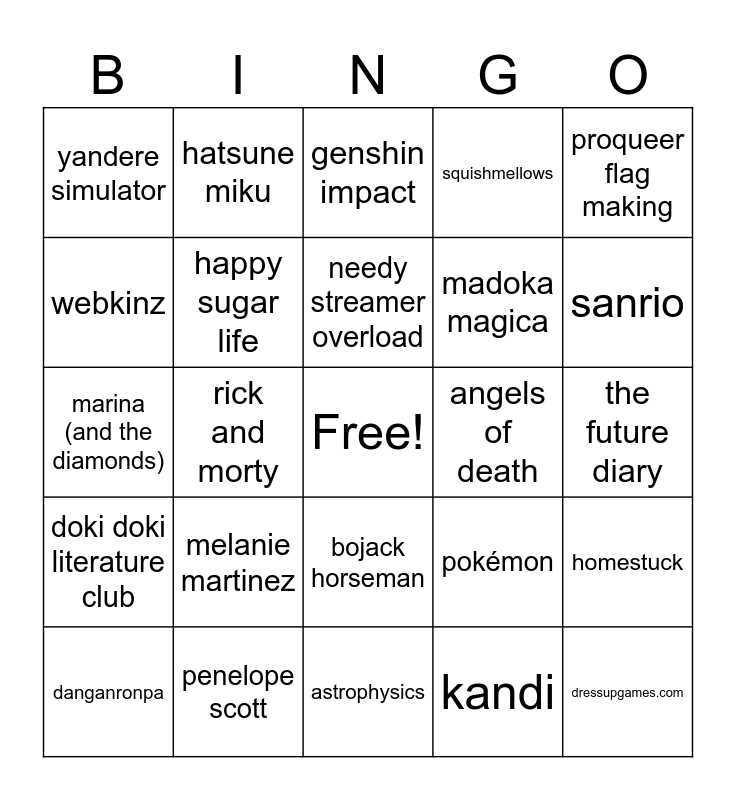This bingo card has a free space and 24 words: melanie martinez, penelope scott, needy streamer overload, danganronpa, proqueer flag making, yandere simulator, webkinz, hatsune miku, angels of death, bojack horseman, madoka magica, marina (and the diamonds), pokémon, homestuck, happy sugar life, kandi, the future diary, genshin impact, sanrio, rick and morty, dressupgames.com, doki doki literature club, squishmellows and astrophysics.