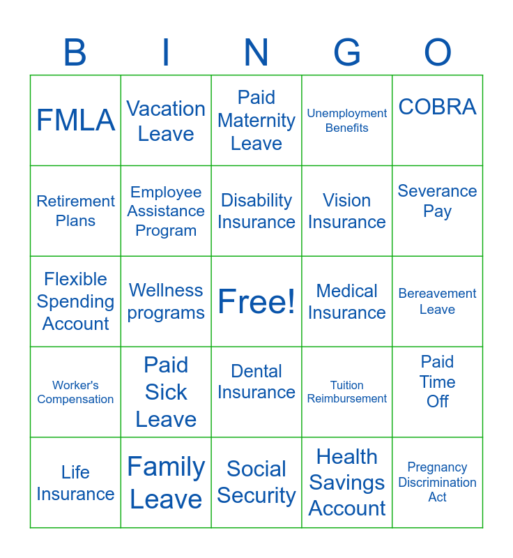 This bingo card has a free space and 24 words: Paid Sick Leave, Family Leave, Disability Insurance, Life Insurance, COBRA, FMLA, Retirement Plans, Vacation Leave, Medical Insurance, Dental Insurance, Vision Insurance, Flexible Spending Account, Tuition Reimbursement, Paid Time Off, Employee Assistance Program, Health Savings Account, Bereavement Leave, Paid Maternity Leave, Severance Pay, Wellness programs, Pregnancy Discrimination Act, Worker's Compensation, Unemployment Benefits and Social Security.