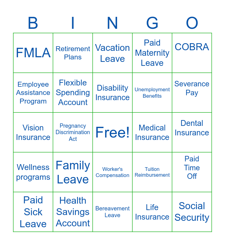 This bingo card has a free space and 24 words: Paid Sick Leave, Family Leave, Disability Insurance, Life Insurance, COBRA, FMLA, Retirement Plans, Vacation Leave, Medical Insurance, Dental Insurance, Vision Insurance, Flexible Spending Account, Tuition Reimbursement, Paid Time Off, Employee Assistance Program, Health Savings Account, Bereavement Leave, Paid Maternity Leave, Severance Pay, Wellness programs, Pregnancy Discrimination Act, Worker's Compensation, Unemployment Benefits and Social Security.