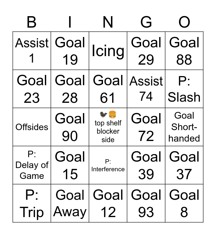 This bingo card has a free space and 46 words: Goal 7, Goal 8, Goal 9, Goal 12, Goal 15, Goal 17, Goal 19, Goal 22, Goal 23, Goal 27, Goal 28, Goal 29, Goal 37, Goal 39, Goal 43, Goal 59, Goal 61, Goal 72, Goal 77, Goal 88, Goal 90, Goal 93, Assist 1, Assist 74, P: High Stick, P: Slash, P: Trip, P: Hold, P: Interference, P: Delay of Game, P: Rough, P: USLC, P: Fight, P: GM, Goal Home, Goal Away, Goal Short-handed, Gobbled Up, FUBV, Crimes on 18, Crimes on 23, Icing, Offsides, Puck in stands, Mysterious review and Bad timing 59.