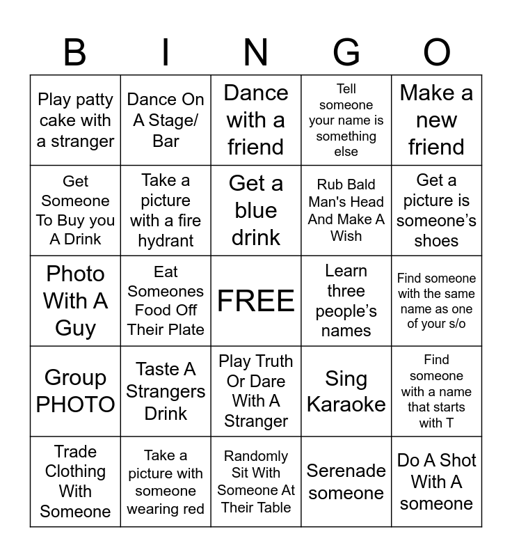 This bingo card has a free space and 24 words: Taste A Strangers Drink, Take a picture with someone wearing red, Get a blue drink, Trade Clothing With Someone, Make a new friend, Play patty cake with a stranger, Get Someone To Buy you A Drink, Dance On A Stage/ Bar, Learn three people’s names, Play Truth Or Dare With A Stranger, Rub Bald Man's Head And Make A Wish, Photo With A Guy, Sing Karaoke, Find someone with a name that starts with T, Take a picture with a fire hydrant, Serenade someone, Find someone with the same name as one of your s/o, Dance with a friend, Get a picture is someone’s shoes, Eat Someones Food Off Their Plate, Do A Shot With A someone, Group PHOTO, Tell someone your name is something else and Randomly Sit With Someone At Their Table.