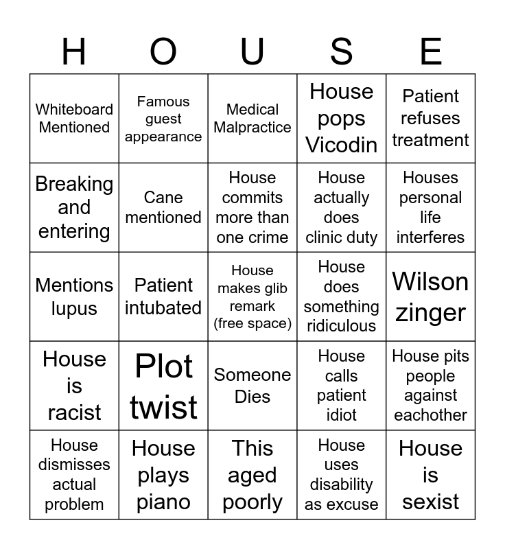 This bingo card has a free space and 37 words: House uses portable TV, CGI of inside body, House is weird towards cuddy, Cane mentioned, House pits people against eachother, Plot twist, House commits more than one crime, Romantic tension (Hilson), Patient refuses treatment, Treatment makes patient worse, Patient intubated, House pops Vicodin, House is sexist, Wilson zinger, Breaking and entering, House is racist, Patient Seizes/Strokes, Medical Malpractice, Someone Dies, House does something ridiculous, Whiteboard Mentioned, Houses personal life interferes, House dismisses actual problem, This aged poorly, House watches soap, House uses disability as excuse, Famous guest appearance, That’s a lot, Motorcycle, House is creepy, Piercing blue eyes, House plays piano, Mentions lupus, House does something despite cuddy, House calls patient idiot, House actually does clinic duty and House says something cryptic.