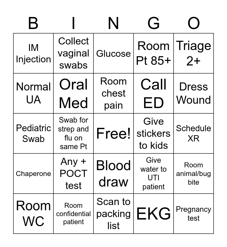 This bingo card has a free space and 29 words: Room WC, Ortho BP, Swab for strep and flu on same Pt, Ear Irrigation, IM Injection, Glucose, Oral Med, Any + POCT test, Give stickers to kids, Room confidential patient, Schedule XR, Pregnancy test, Scan to packing list, EKG, Dress Wound, Visual Acuity, Blood draw, Chaperone, Triage 2+, Pediatric Swab, Give water to UTI patient, Apply DME, Call ED, Normal UA, Room Pt 85+, Collect vaginal swabs, Room animal/bug bite, Room chest pain and Med Watch.