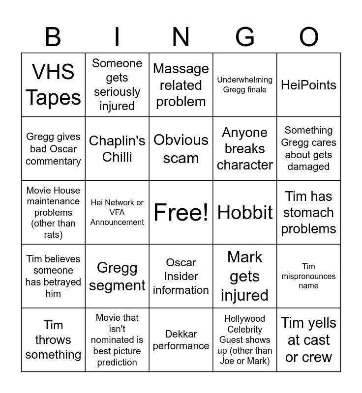 This bingo card has a free space and 47 words: Tim gets more than a little drunk, Tim yells at cast or crew, Dekkar member does non-music task, Dekkar performance, Gregg segment, Tim yells at Gregg, Someone gets seriously injured, Tim has a mental health crisis, Gregg gives bad Oscar commentary, Joe Estevez says “Well…”, Chaplin's Chilli, Underwhelming Gregg finale, Tim mispronounces name, Mark gets injured, Bags of popcorn, Toni Newman drinks, Obvious scam, Hobbit, Footage from Zombi 2, HeiPoints, Hei Network or VFA Announcement, Hollywood Celebrity Guest shows up (other than Joe or Mark), VHS Tapes, Anyone breaks character, Movie Anniversary, Something Gregg cares about gets damaged, Tim throws something, Terrible sound editing (soundtrack or sound effect only), Oscar Insider information, Tim believes someone has betrayed him, Bad Costumes, Oscar Fever (song), Slideshow set to Royalty Free Music, Promised Celebrity guest that never shows up, Greg asks "From?" or "And?" (asking what an actor has been in), Movie that isn't nominated is best picture prediction, Tim has stomach problems, Popcorn Eaten, Mark Proksh Impersonation, Empty Bottle, Rat problem, Massage related problem, Movie House maintenance problems (other than rats), Eviction from movie house, Amato group shows up (other than G), G Amato appearance and Prostitution.