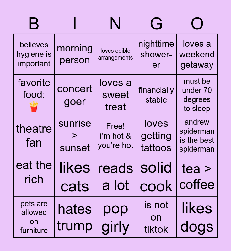 This bingo card has a free space and 24 words: likes cats, hates trump, loves a sweet treat, pets are allowed on furniture, loves a weekend getaway, believes hygiene is important, favorite food: 🍟, morning person, loves getting tattoos, reads a lot, financially stable, theatre fan, solid cook, tea > coffee, concert goer, is not on tiktok, andrew spiderman is the best spiderman, loves edible arrangements, must be under 70 degrees to sleep, sunrise > sunset, likes dogs, eat the rich, nighttime shower-er and pop girly.