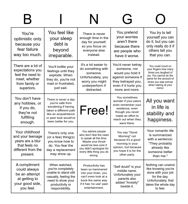 This bingo card has a free space and 24 words: There's only one (or a few) thing(s) you know how to do. You fear the day a replacement may show up., When watched, you're completely unable to stand still casually, feeling the need to show your productivity or responsibility., It's a lot easier to do something with someone. Unfortunately, you worry you might underperform if distracted., A compliment could always be an attempt at getting to your good side, you feel., You try to tell yourself you can do it, but you can only really do it if others tell you that you can., You're optimistic only because you fear failure way too much., There are a lot of expectations you feel the need to meet, whether from family or superiors., You feel like your sleep debt is beyond irreparable., You sometimes wonder if your peers even remember your existence, even though you never made an effort to reach out when they were there., You admire people who don't feel the need to speak all the time. Maybe your throat would be less sore if you didn't apologize for every little thing you do wrong., You'd never betray someone, nor would you hold it against someone if they betrayed you, even if it hurts you more and more., You don't have any hobbies, or if you do, they're not fulfilling enough., You say "Good Morning" not because it's a good morning in your opinion, but because you hope it is for the other party., Your romantic life is summarized with a sentence: "They probably already like someone better than me.", You'll bottle your feelings until they explode. When they do, you're not mad or frustrated, just sad., "Self doubt" is your middle name. Unfortunately your parents also added "Anxiety" beside it., All you want in life is stability and happiness., There is never enough time in the day for yourself, so you focus on everyone else instead., You could count on your fingers how many times you laughed of joy. You cannot do the same for the amount of times you saw sorrow when staring at your mirror., There is never a day you're safe from wondering if having taken a different path like an acquaintance or peer took would've been better for you., Nothing can unwind like knowing you're done with your job for the day. Unfortunately, that takes the whole day to feel., Your childhood and your teenage years are a blur that feels no different from the present., You pretend your worries aren't there because there are people who have it worse. and Productivity has been so hammered into your brain, you can't even look at a book the same way if it has 'no use' past entertainment..