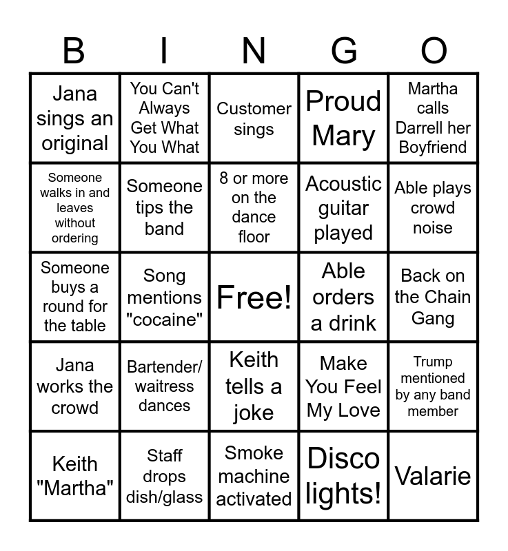 This bingo card has a free space and 29 words: Keith "Martha", Emily Sings, Song mentions "cocaine", Keith tells Joy chords, Jana sings an original, Customer sings, Someone tips the band, Bartender/ waitress dances, Able orders a drink, Staff drops dish/glass, Back on the Chain Gang, Valarie, Smoke machine activated, Disco lights!, Able plays crowd noise, Birthday! Shot Shot Shot!, Keith tells a joke, Jana works the crowd, Martha calls Darrell her Boyfriend, Someone buys a round for the table, Make You Feel My Love, Any song by Sublime, Acoustic guitar played, Someone walks in and leaves without ordering, Proud Mary, You Can't Always Get What You What, Trump mentioned by any band member, 8 or more on the dance floor and Any Mash-Up.