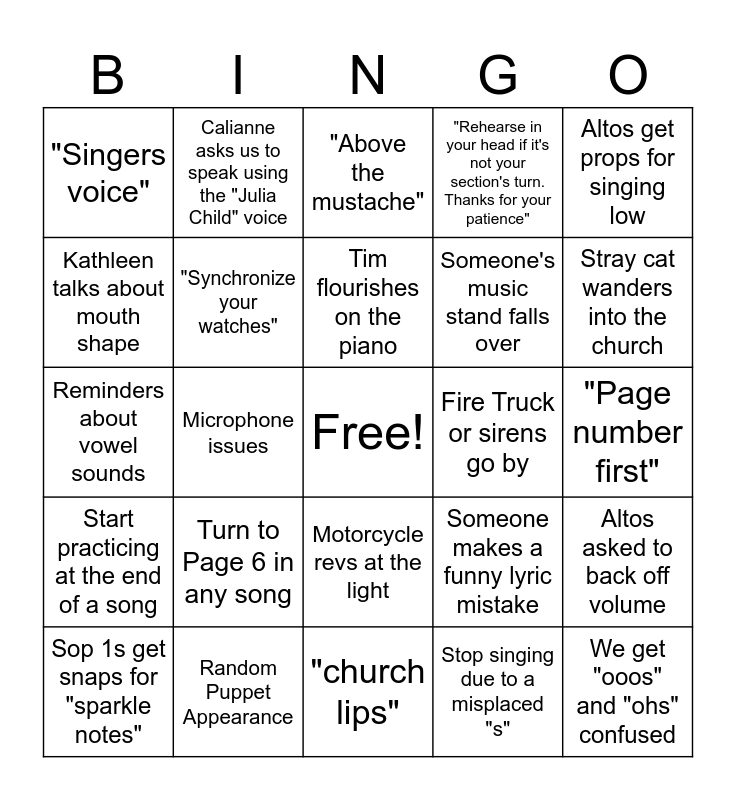 This bingo card has a free space and 24 words: Turn to Page 6 in any song, Random Puppet Appearance, Tim flourishes on the piano, Sop 1s get snaps for "sparkle notes", Altos get props for singing low, "Singers voice", Kathleen talks about mouth shape, Calianne asks us to speak using the "Julia Child" voice, Fire Truck or sirens go by, Motorcycle revs at the light, Someone's music stand falls over, Reminders about vowel sounds, Someone makes a funny lyric mistake, Altos asked to back off volume, "Synchronize your watches", Stop singing due to a misplaced "s", "Page number first", "Above the mustache", Stray cat wanders into the church, Microphone issues, We get "ooos" and "ohs" confused, Start practicing at the end of a song, "Rehearse in your head if it's not your section's turn. Thanks for your patience" and "church lips".