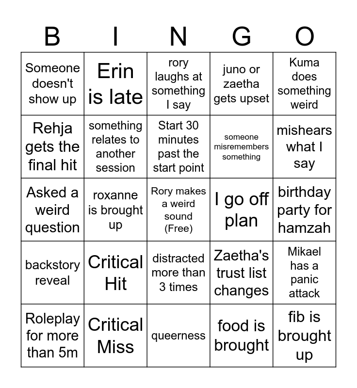 This bingo card has a free space and 24 words: Critical Hit, Critical Miss, Start 30 minutes past the start point, Roleplay for more than 5m, Kuma does something weird, Someone doesn't show up, Rehja gets the final hit, Erin is late, I go off plan, distracted more than 3 times, someone misremembers something, Asked a weird question, Zaetha's trust list changes, Mikael has a panic attack, something relates to another session, food is brought, birthday party for hamzah, rory laughs at something I say, mishears what I say, roxanne is brought up, fib is brought up, backstory reveal, juno or zaetha gets upset and queerness.