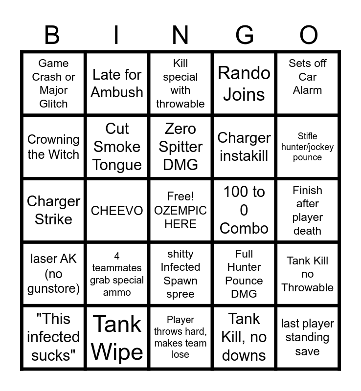 This bingo card has a free space and 24 words: 4 teammates grab special ammo, Tank Wipe, Zero Spitter DMG, "This infected sucks", Sets off Car Alarm, Game Crash or Major Glitch, Crowning the Witch, Late for Ambush, 100 to 0 Combo, shitty Infected Spawn spree, Charger instakill, Charger Strike, Full Hunter Pounce DMG, Tank Kill no Throwable, Cut Smoke Tongue, Tank Kill, no downs, Finish after player death, Kill special with throwable, Stifle hunter/jockey pounce, CHEEVO, last player standing save, laser AK (no gunstore), Rando Joins and Player throws hard, makes team lose.