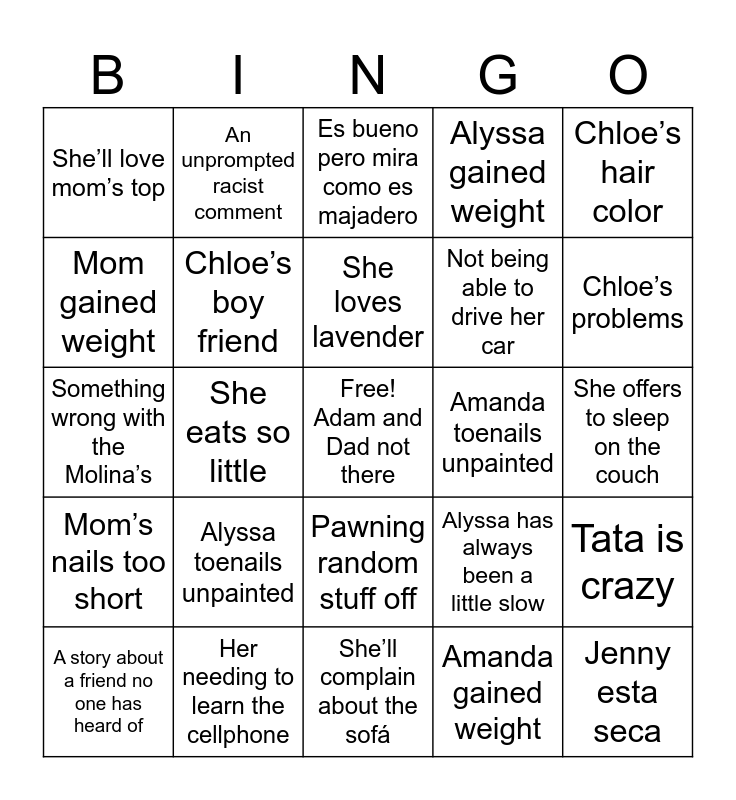 This bingo card has a free space and 24 words: Alyssa toenails unpainted, Her needing to learn the cellphone, She loves lavender, A story about a friend no one has heard of, Chloe’s hair color, She’ll love mom’s top, Mom gained weight, An unprompted racist comment, Amanda toenails unpainted, Pawning random stuff off, Not being able to drive her car, Something wrong with the Molina’s, Alyssa has always been a little slow, Tata is crazy, Chloe’s boy friend, Amanda gained weight, She offers to sleep on the couch, Es bueno pero mira como es majadero, Chloe’s problems, She eats so little, Jenny esta seca, Mom’s nails too short, Alyssa gained weight and She’ll complain about the sofá.