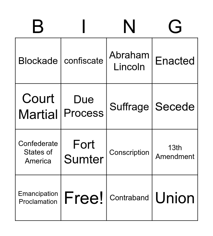This bingo card has 16 words: Free!, 13th Amendment, Abraham Lincoln, Blockade, Confederate States of America, confiscate, Conscription, Contraband, Court Martial, Due Process, Emancipation Proclamation, Enacted, Fort Sumter, Secede, Suffrage and Union.