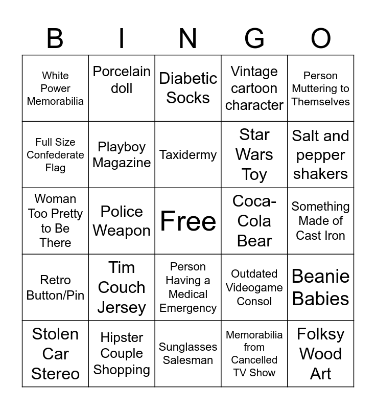 This bingo card has a free space and 29 words: Stolen Car Stereo, Live Animal for Sale, Police Weapon, Child Being Beaten, White Power Memorabilia, Diabetic Socks, Playboy Magazine, Tim Couch Jersey, Coca-Cola Bear, Hipster Couple Shopping, Something Made of Cast Iron, Folksy Wood Art, Sunglasses Salesman, Memorabilia from Cancelled TV Show, Salt and pepper shakers, Fake Sharpies, Person Having a Medical Emergency, Retro Button/Pin, Person Muttering to Themselves, Woman Too Pretty to Be There, Outdated Videogame Consol, Honey for Sale, Star Wars Toy, Full Size Confederate Flag, Vintage cartoon character, Porcelain doll, Beanie Babies, Taxidermy and Quilt.
