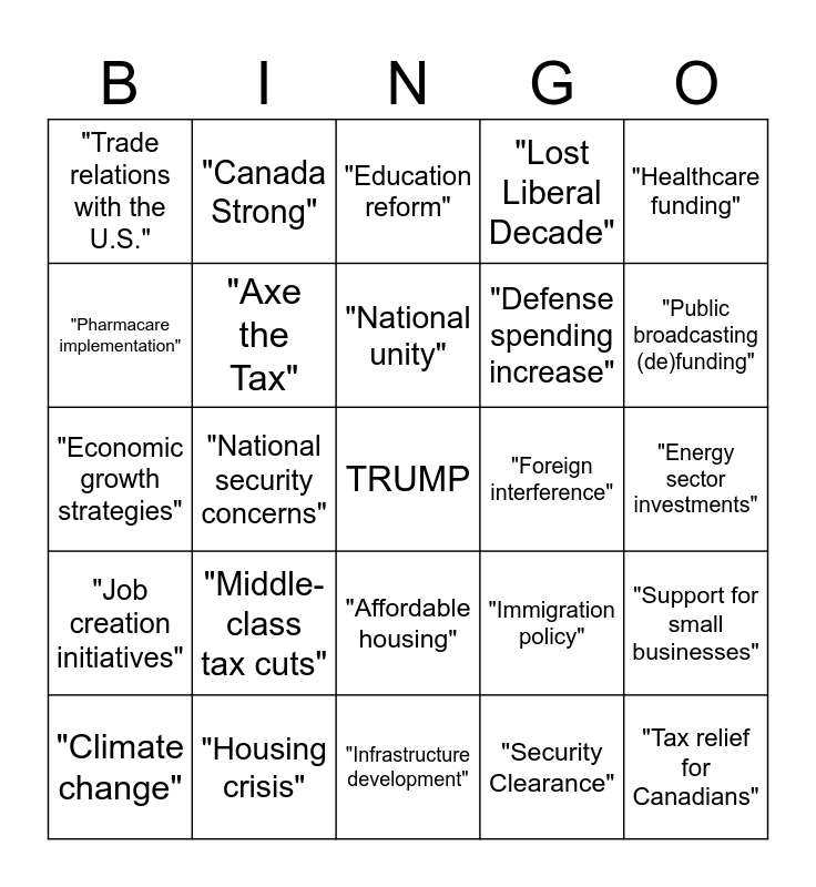 This bingo card has a free space and 24 words: "Middle-class tax cuts", "Housing crisis", "National unity", "Climate change", "Healthcare funding", "Trade relations with the U.S.", "Pharmacare implementation", "Canada Strong", "Foreign interference", "Affordable housing", "Defense spending increase", "Economic growth strategies", "Immigration policy", "Support for small businesses", "Axe the Tax", "Security Clearance", "Energy sector investments", "Education reform", "Public broadcasting (de)funding", "National security concerns", "Tax relief for Canadians", "Job creation initiatives", "Lost Liberal Decade" and "Infrastructure development".