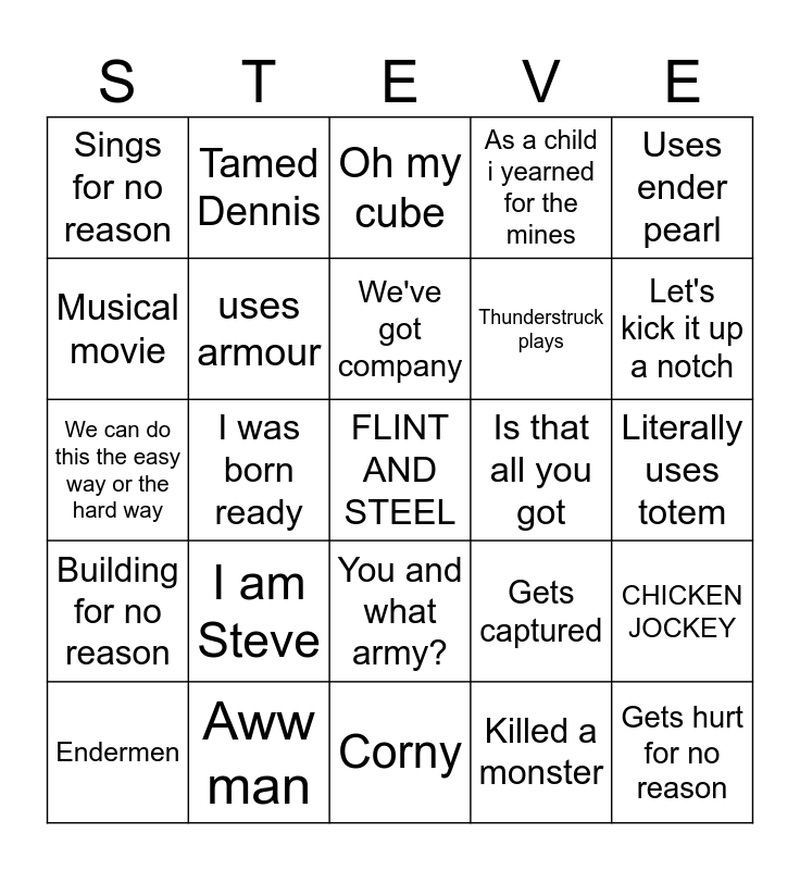 This bingo card has a free space and 24 words: I am Steve, Aww man, We've got company, Endermen, Uses ender pearl, Sings for no reason, Musical movie, Tamed Dennis, Is that all you got, You and what army?, Thunderstruck plays, We can do this the easy way or the hard way, Gets captured, CHICKEN JOCKEY, uses armour, Killed a monster, Literally uses totem, Oh my cube, Let's kick it up a notch, I was born ready, Gets hurt for no reason, Building for no reason, As a child i yearned for the mines and Corny.