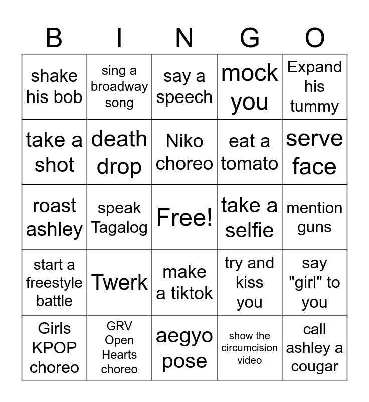 This bingo card has a free space and 24 words: Twerk, GRV Open Hearts choreo, Niko choreo, Girls KPOP choreo, Expand his tummy, shake his bob, take a shot, sing a broadway song, take a selfie, make a tiktok, eat a tomato, roast ashley, try and kiss you, say "girl" to you, death drop, show the circumcision video, mention guns, say a speech, serve face, speak Tagalog, call ashley a cougar, start a freestyle battle, mock you and aegyo pose.