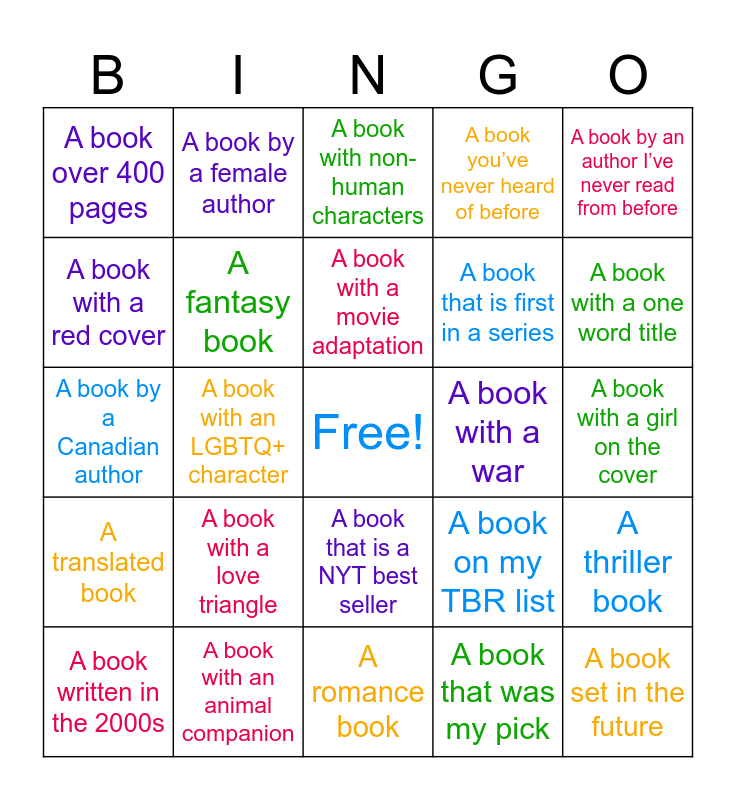This bingo card has a free space and 24 words: A book with a love triangle, A book with an animal companion, A book with a movie adaptation, A book written in the 2000s, A book by an author I’ve never read from before, A book over 400 pages, A book with a red cover, A book by a female author, A book with a war, A book that is a NYT best seller, A book that is first in a series, A book by a Canadian author, A book on my TBR list, A thriller book, A fantasy book, A book that was my pick, A book with a girl on the cover, A book with non-human characters, A book with a one word title, A book with an LGBTQ+ character, A book set in the future, A translated book, A book you’ve never heard of before and A romance book.
