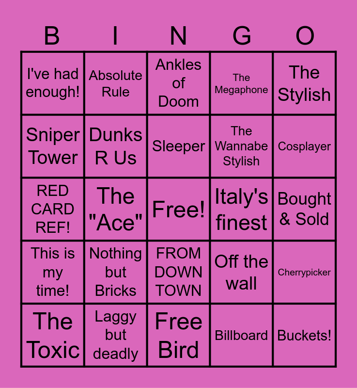 This bingo card has a free space and 38 words: Egoing, "My Team Sucks!", Ace Dribble into Fade, Dunks R Us, Cherrypicker, Nothing but Bricks, Sleeper, Panic Dribbler, The Stylish, The Wannabe Stylish, The "Ace", The Megaphone, Buckets!, Bought & Sold, Sniper Tower, This is my time!, Pump-fake of Doom, Ankles of Doom, Narcoleptic, Italy's finest, I've had enough!, Laggy but deadly, Cosplayer, The Toxic, DENIED, Free Bird, The Expressive, The Hacker, The "Hacker", The Ghost, The Clutch, FROM DOWN TOWN, Billboard, Absolute Rule, Needless Full Court, Off the wall, RED CARD REF! and The Obnoxious.