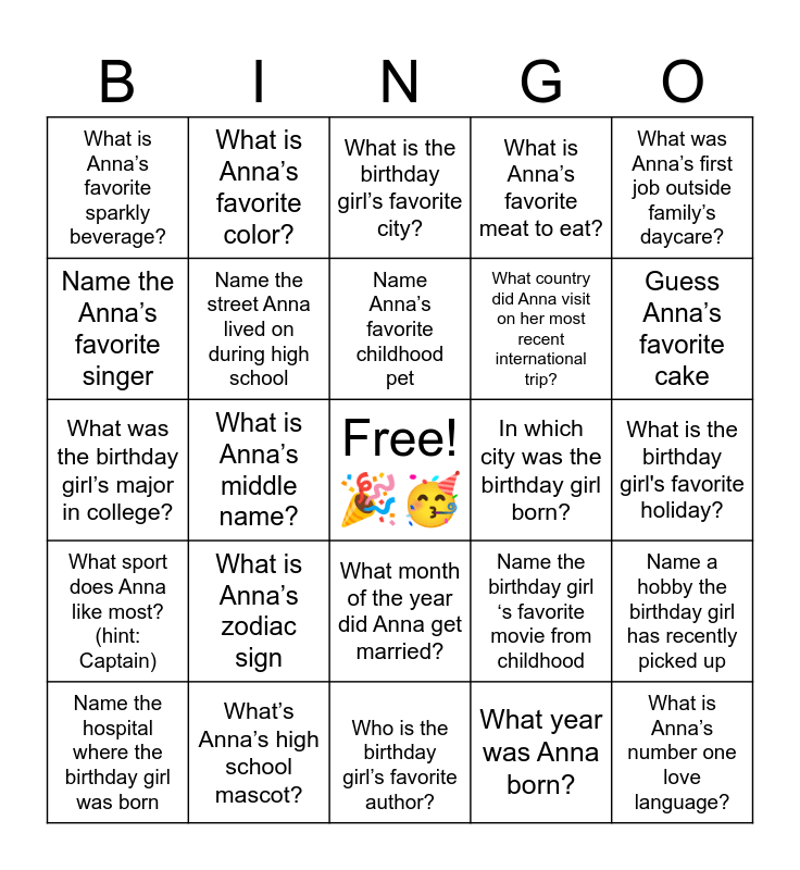 This bingo card has a free space and 24 words: Name the hospital where the birthday girl was born, What is Anna’s zodiac sign, Name Anna’s favorite childhood pet, What year was Anna born?, What was Anna’s first job outside family’s daycare?, What is Anna’s favorite sparkly beverage?, What is Anna’s favorite color?, What is the birthday girl’s favorite city?, In which city was the birthday girl born?, What is the birthday girl's favorite holiday?, What was the birthday girl’s major in college?, Name the street Anna lived on during high school, Name the birthday girl ‘s favorite movie from childhood, Name a hobby the birthday girl has recently picked up, Name the Anna’s favorite singer, What’s Anna’s high school mascot?, Who is the birthday girl’s favorite author?, What is Anna’s favorite meat to eat?, Guess Anna’s favorite cake, What sport does Anna like most?(hint: Captain), What is Anna’s middle name?, What month of the year did Anna get married?, What country did Anna visit on her most recent international trip? and What is Anna’s number one love language?.