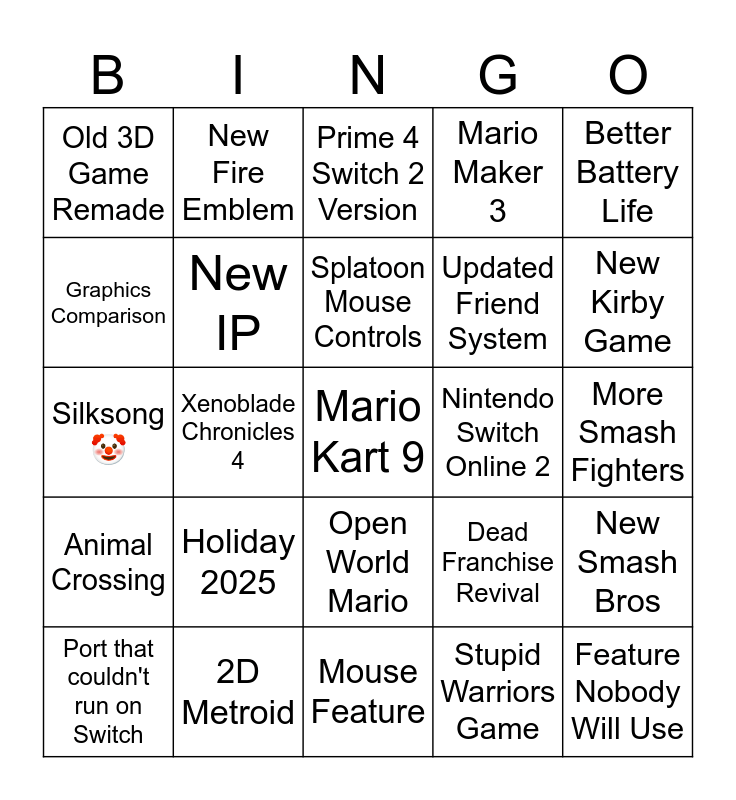 This bingo card has a free space and 24 words: Holiday 2025, 2D Metroid, Splatoon Mouse Controls, Port that couldn't run on Switch, Better Battery Life, Old 3D Game Remade, Graphics Comparison, New Fire Emblem, Nintendo Switch Online 2, Open World Mario, Updated Friend System, Silksong🤡, Dead Franchise Revival, New Smash Bros, New IP, Stupid Warriors Game, More Smash Fighters, Prime 4 Switch 2 Version, New Kirby Game, Xenoblade Chronicles 4, Feature Nobody Will Use, Animal Crossing, Mario Maker 3 and Mouse Feature.
