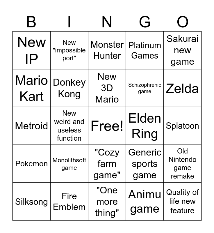 This bingo card has a free space and 24 words: Monolithsoft game, Fire Emblem, New 3D Mario, Silksong, Sakurai new game, New IP, Mario Kart, New "impossible port", Elden Ring, "Cozy farm game", Schizophrenic game, Metroid, Generic sports game, Old Nintendo game remake, Donkey Kong, Animu game, Splatoon, Monster Hunter, Zelda, New weird and useless function, Quality of life new feature, Pokemon, Platinum Games and "One more thing".
