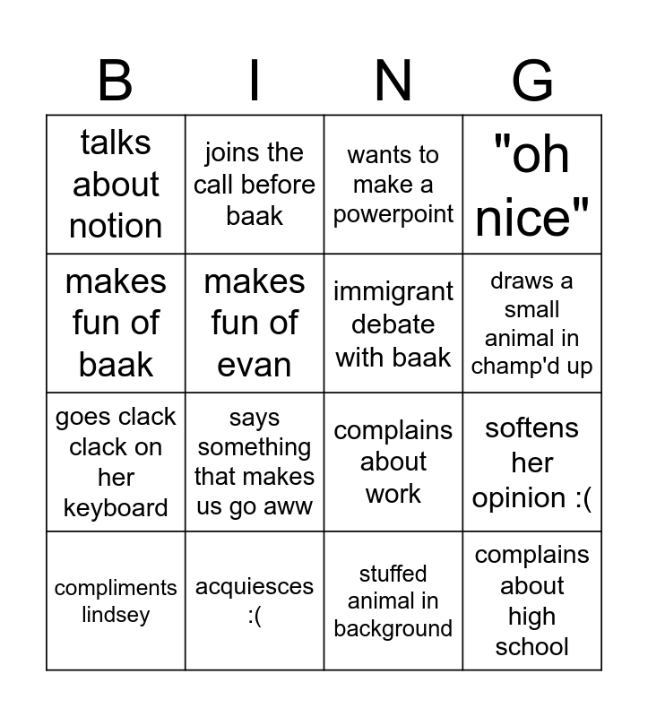 This bingo card has 16 words: acquiesces :(, softens her opinion :(, wants to make a powerpoint, talks about notion, goes clack clack on her keyboard, joins the call before baak, complains about work, stuffed animal in background, makes fun of baak, makes fun of evan, compliments lindsey, "oh nice", says something that makes us go aww, draws a small animal in champ'd up, immigrant debate with baak and complains about high school.