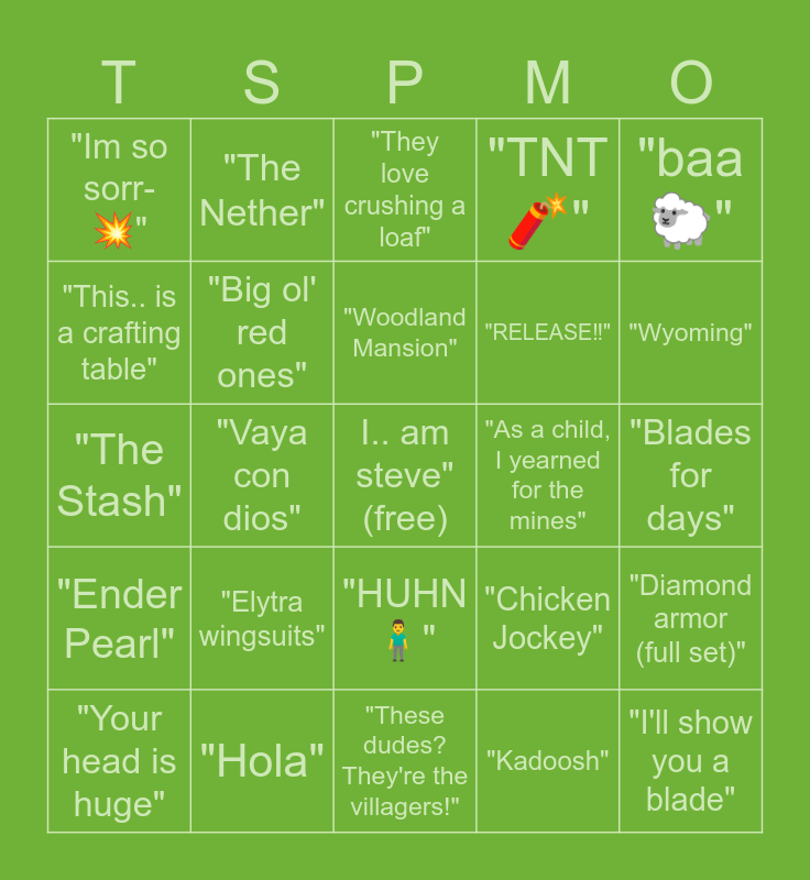 This bingo card has a free space and 27 words: "Chicken Jockey", "Flint n steel", "RELEASE‼️", "These dudes? They're the villagers!", "This.. is a crafting table", "They love crushing a loaf", "The Nether", "Ender Pearl", "As a child, I yearned for the mines", "Diamond armor (full set)", "The Stash", "TNT🧨", "Your head is huge", "Hola", "Wyoming", "Comin in hot🔥🔥", "Big ol' red ones", "Woodland Mansion", "Elytra wingsuits", "Im so sorr-💥", "Blades for days", "Kadoosh", "Vaya con dios", "I'll show you a blade", "HUHN🧍♂️", "baa🐑" and "Steve flying in the air and catching steak".