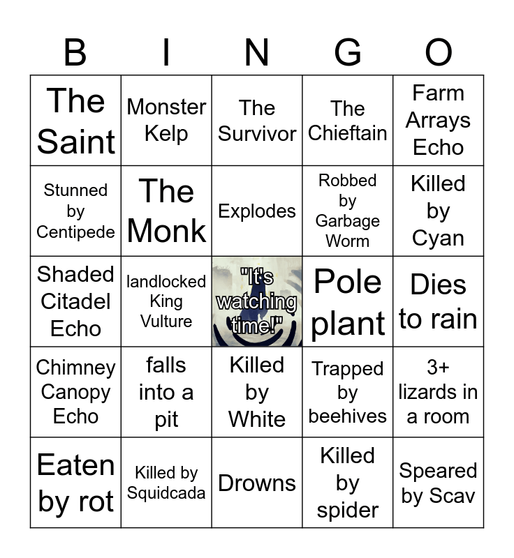 This bingo card has a free space and 29 words: Eaten by rot, Dying within a minute of leaving a shelter, landlocked King Vulture, Dragon Slayer, The Saint, The Survivor, The Monk, falls into a pit, Pole plant, Killed by Squidcada, Dies to rain, Speared by Scav, Drowns, Killed by spider, Killed by Cyan, Killed by Green, Killed by White, Chimney Canopy Echo, Farm Arrays Echo, Shaded Citadel Echo, Trapped by beehives, Stunned by Snails, Robbed by Garbage Worm, Stunned by Centipede, The Chieftain, Monster Kelp, 3+ lizards in a room, Explodes and Gets lost in Shaded Citadel.