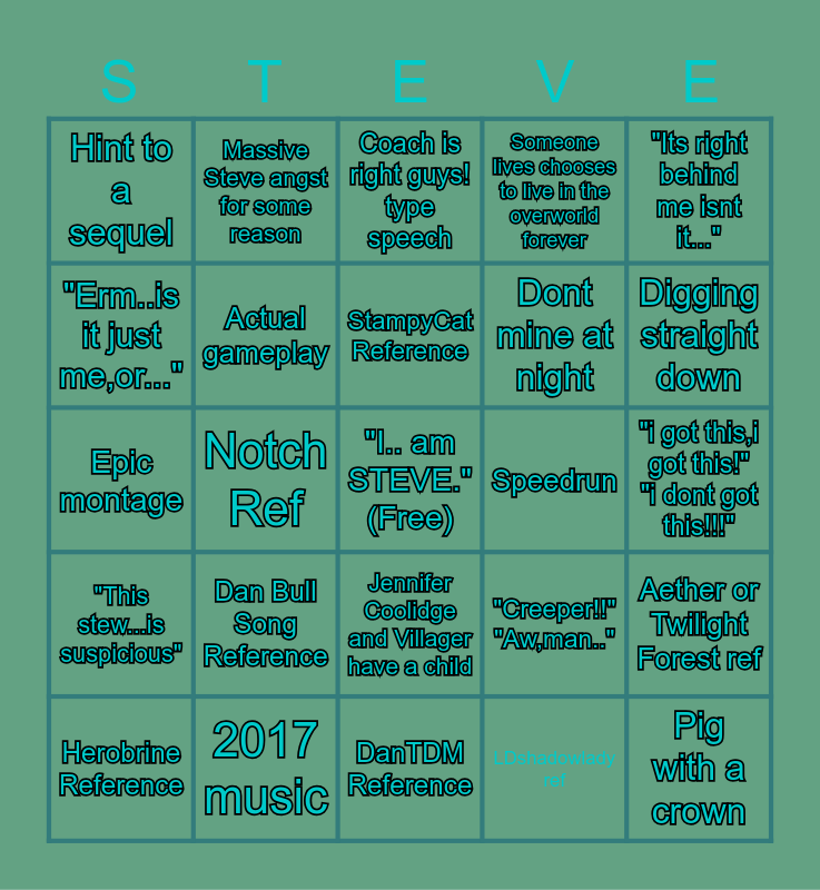 This bingo card has a free space and 25 words: Dan Bull Song Reference, DanTDM Reference, StampyCat Reference, Herobrine Reference, "Its right behind me isnt it...", Hint to a sequel, "Erm..is it just me,or...", Massive Steve angst for some reason, Speedrun, Jennifer Coolidge and Villager have a child, Dont mine at night, Epic montage, "Creeper!!" "Aw,man..", Aether or Twilight Forest ref, Actual gameplay, Story Mode Ref, "i got this,i got this!" "i dont got this!!!", Coach is right guys! type speech, Digging straight down, Notch Ref, Pig with a crown, 2017 music, "This stew...is suspicious", Someone lives chooses to live in the overworld forever and LDshadowlady ref.